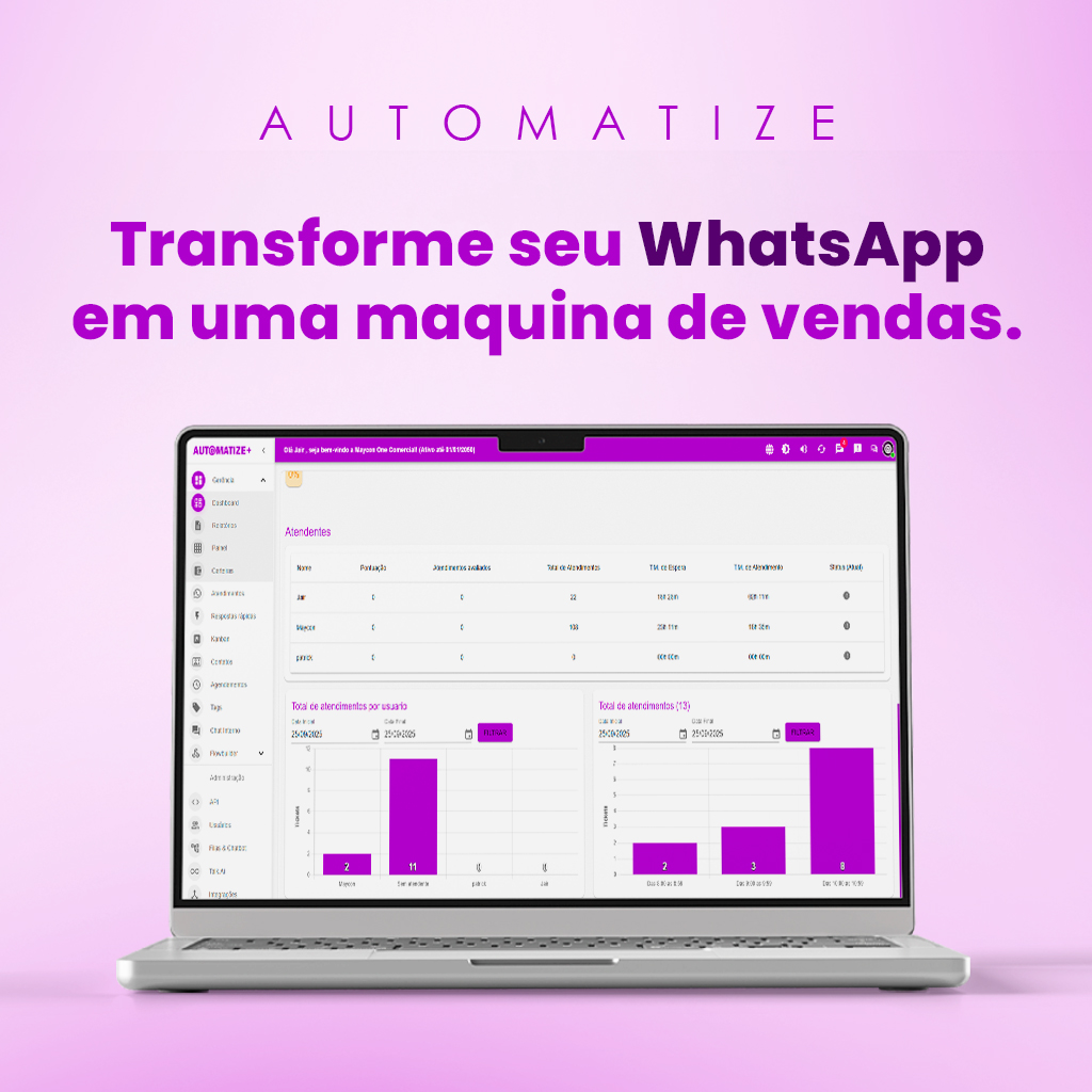 Cansado de perder negócios por falta de atendimento? Venha simplificar com o Automatize, a solução mais completa em mensageria com um Dashboard fácil e intuitivo, além de ser totalmente personalizável, atendendo qualquer necessidade.